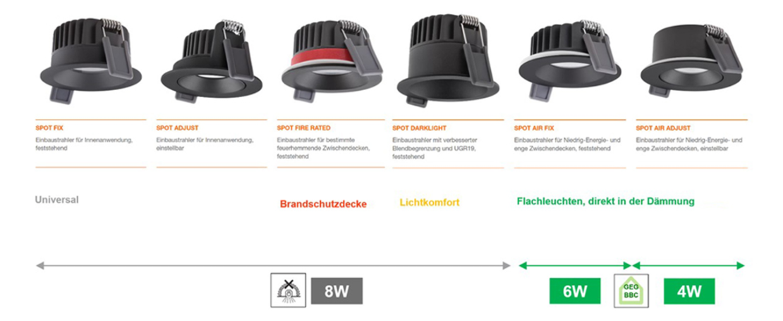 Die SPOTLIGHTS decken auch spezielle Anforderungen im Niedrigenergiehausbau, bei Brandschutzdecken oder in Feuchträumen ab.
